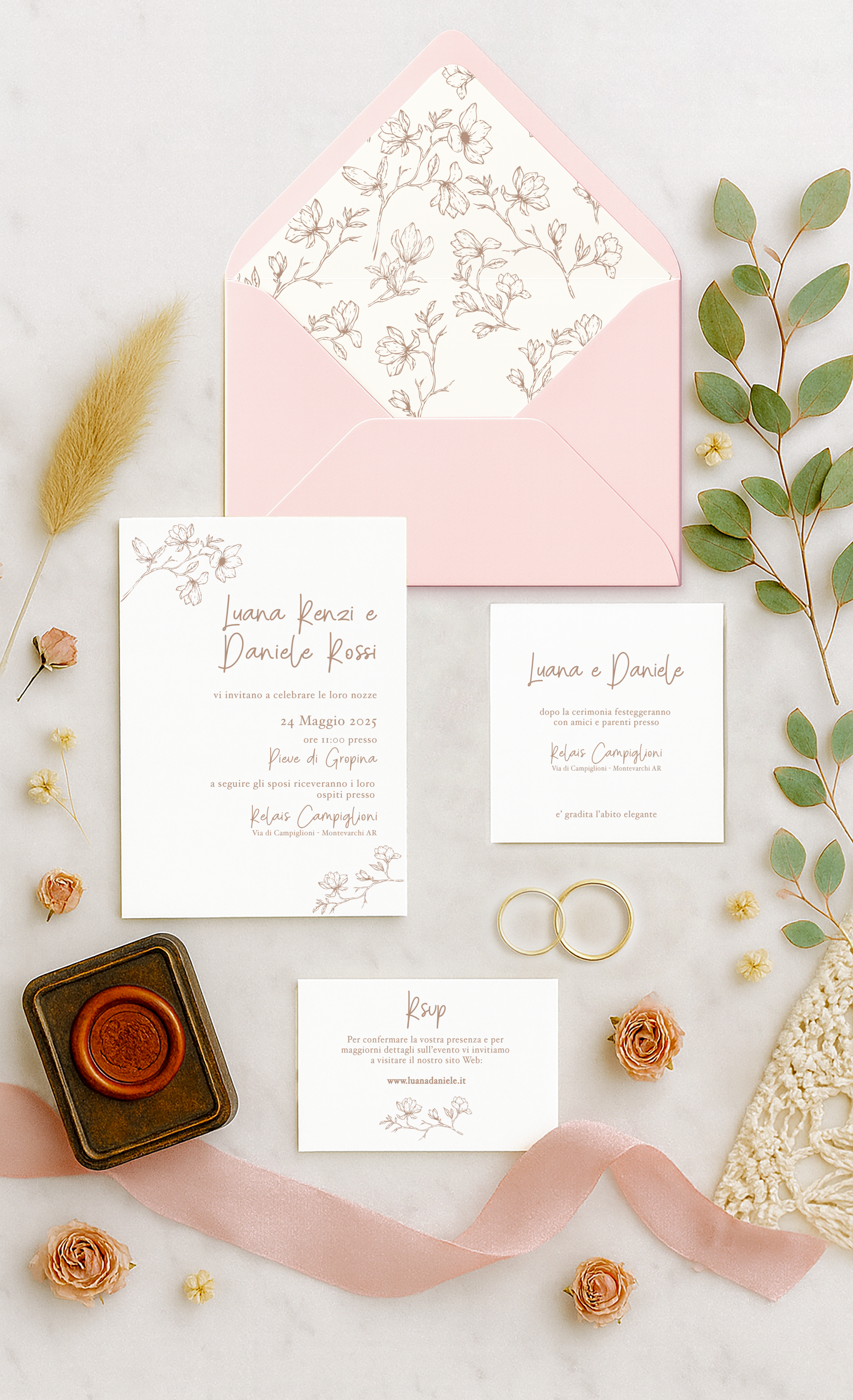 L’elemento grafico principale sono i rametti di magnolia che caratterizzano tutti gli elementi della composizione che può essere ripreso su tanti altri elementi della stationery.